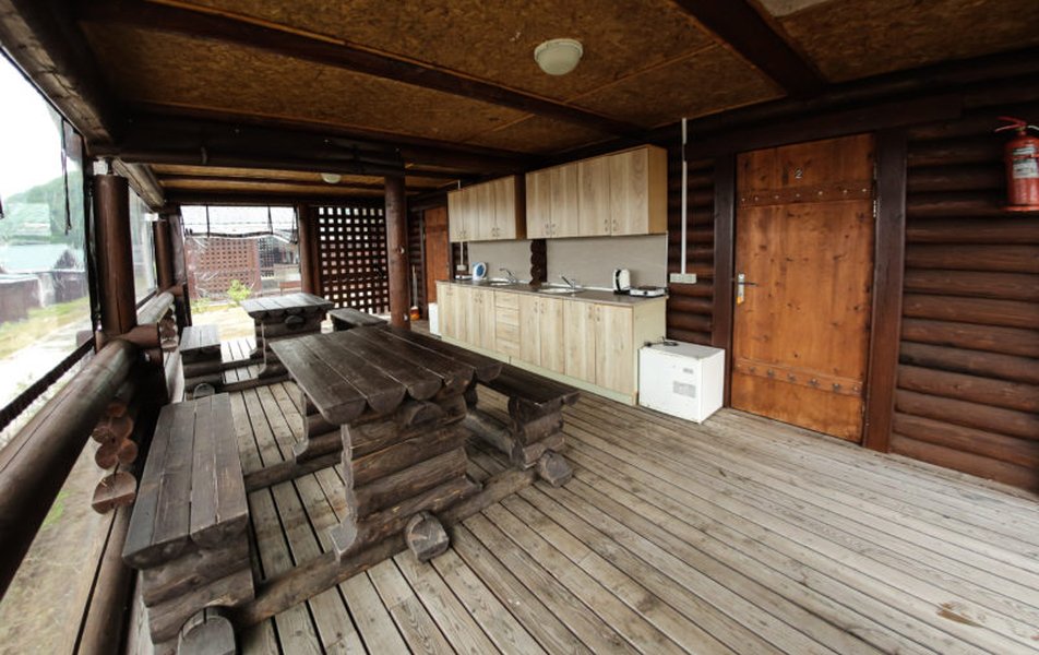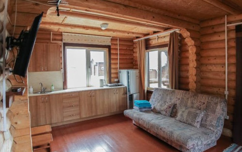 В домике: кровати односпальные, кухонная мебель, прикроватные тумбочки, стол, стулья, мини-кухня, мини-холодильник, набор посуды, плита электрическая, телевизор, электрочайник