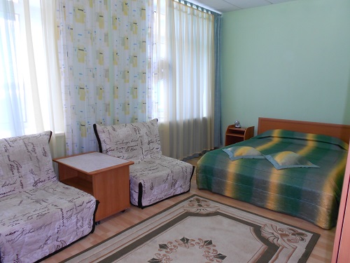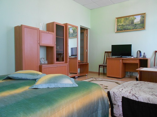 В номере: телевизор, телефон, холодильник, стенка-горка с посудой, радио, двуспальная кровать, 2 кресла- кровати.