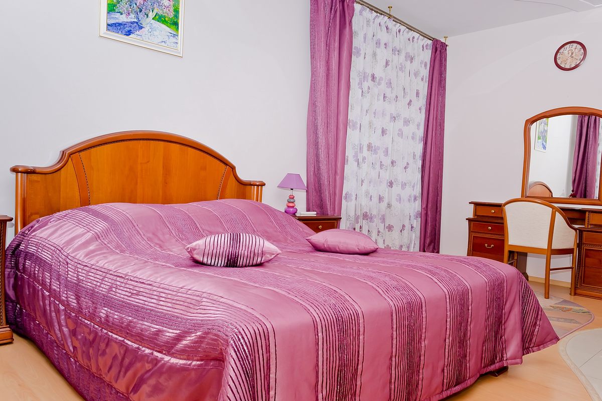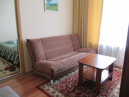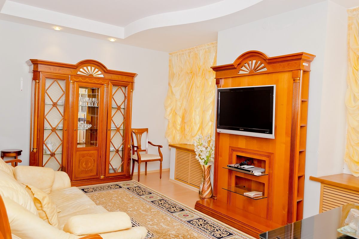 В номере: диван, телевизор, телефон, холодильник, радио, стенка-горка с посудой, журнальный столик, двуспальная кровать, комод.