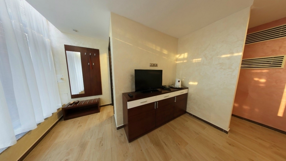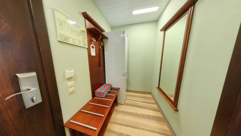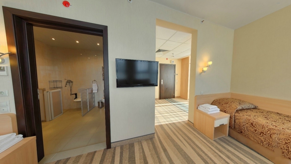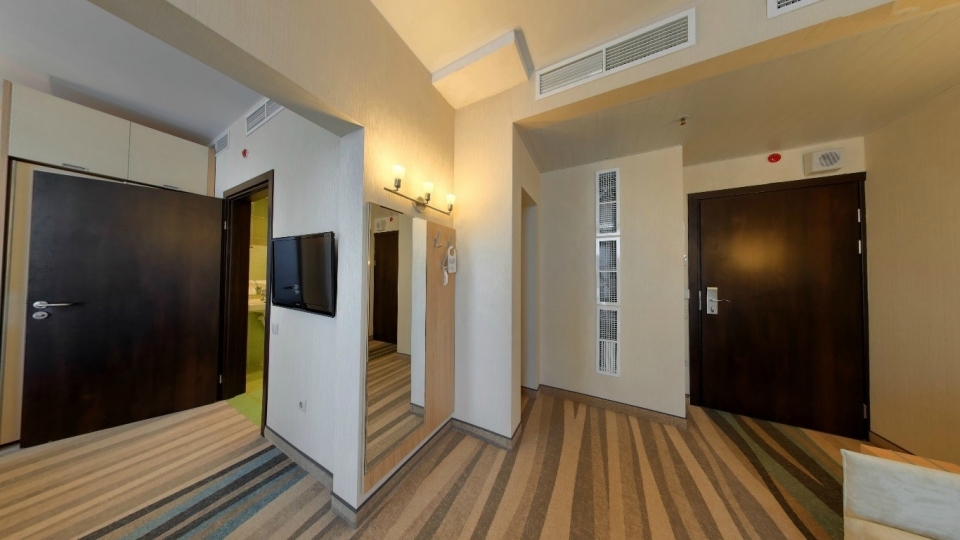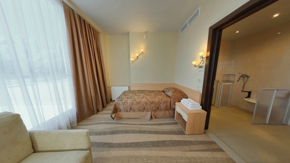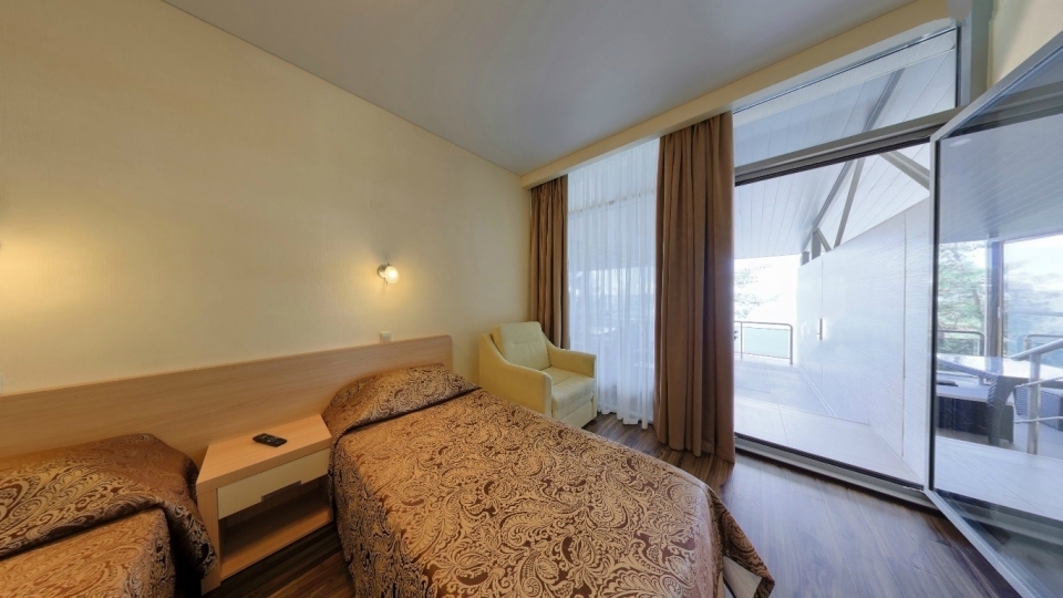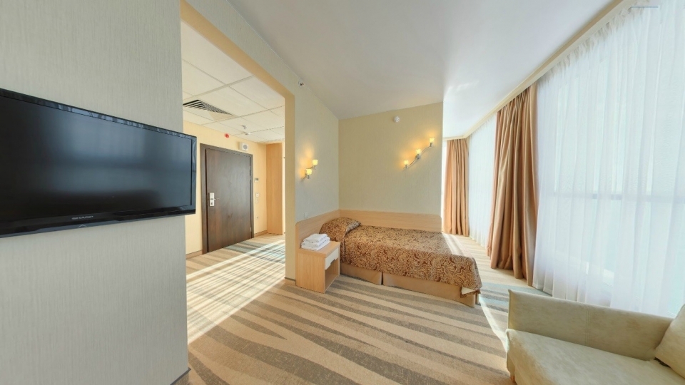 Оснащение номера: две односпальной кровати, кресло-кровать, фригобар, телевизор, сейф, фен, набор посуды: 2 стакана, ваза для фруктов, поднос, wi-fi