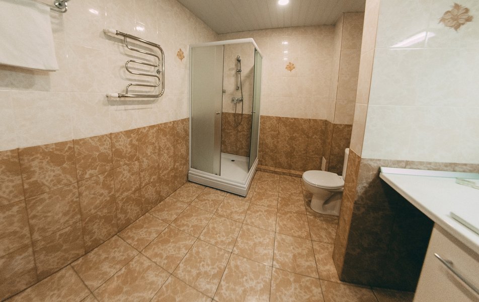 Санузел: душ, раковина, унитаз, туалетные принадлежности, фен