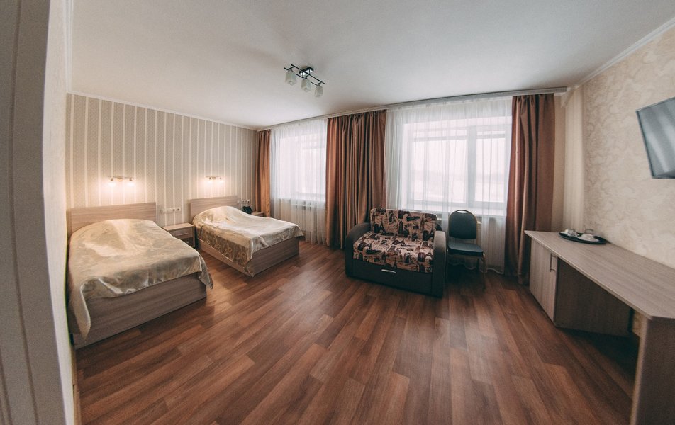 В номере: вешалка, диван, зеркало, кровати односпальные /одна двуспальная кровать, прикроватные тумбочки, стол, стул, шкаф, кондиционер, мини-холодильник, телевизор ЖК, телефон, чайный набор посуды, электрочайник