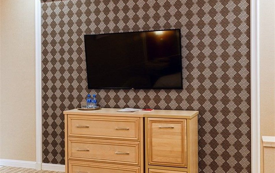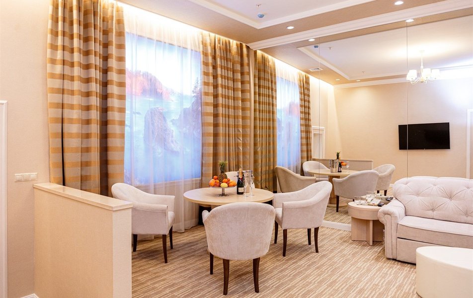 В номере: вешалка, зеркало, диван, кровать двуспальная, прикроватные тумбочки, стол, стулья, шкаф, кондиционер, сейф, телевизор, телефон, холодильник