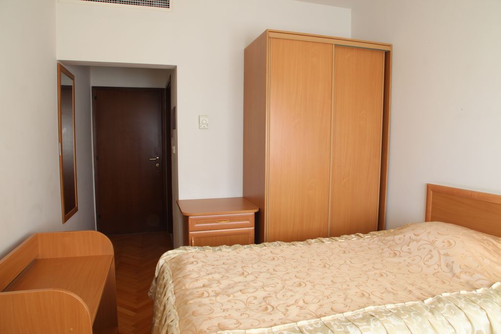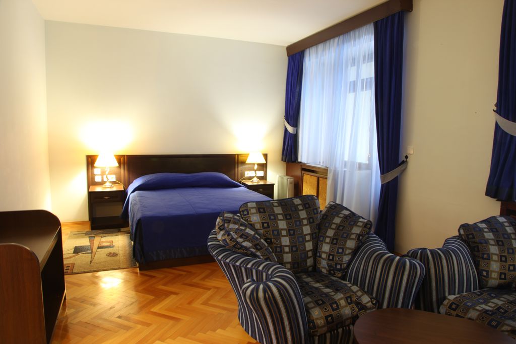 В номере: одна двуспальная либо две односпальные кровати, прикроватные тумбы, шкаф, стол, стулья, журнальный столик, мягкая мебель, кондиционер, спутниковое телевидение, холодильник, электрочайник