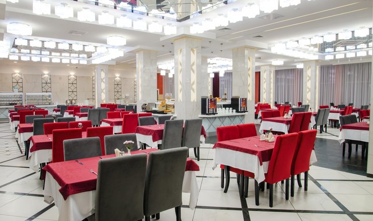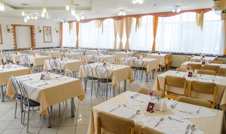 Корпус «Алмаз», ресторан. Залы самообслуживания по системе "шведский стол" на 190 и 160 мест, где порционирование и выдача супов и вторых блюд осуществляется поварами. Обратите внимание, что вынос еды и посуды из обеденного зала не предусмотрен.