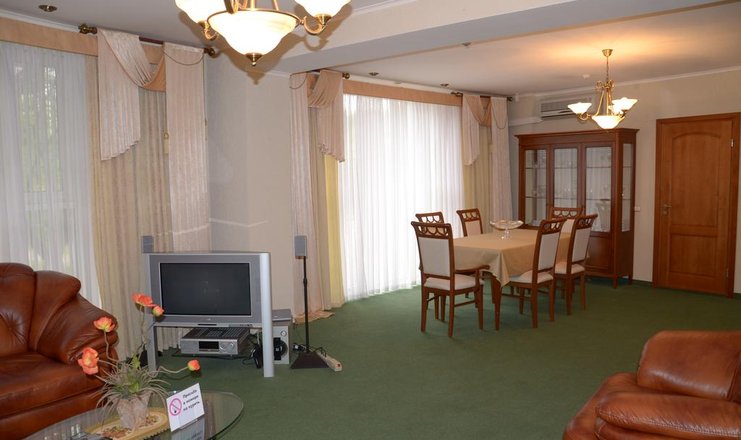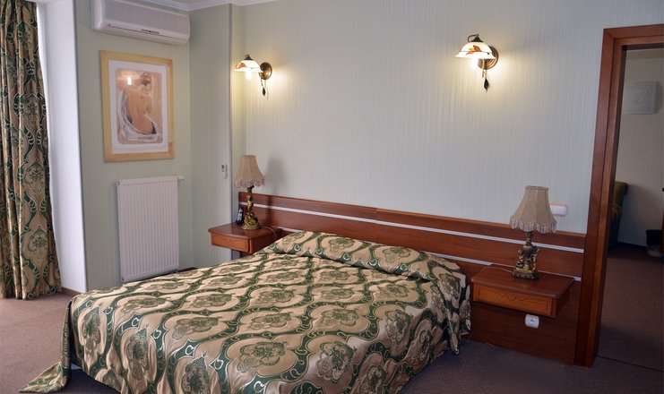 В номере: вешалка, диван раскладной, зеркало, комод, кровать двуспальная, прикроватные тумбочки, стулья, тумба, шкаф-купе, кондиционер, мини-холодильник, сейф, телевизор ЖК, телефон, теплый пол, холодильник, чайный набор посуды, электрочайник