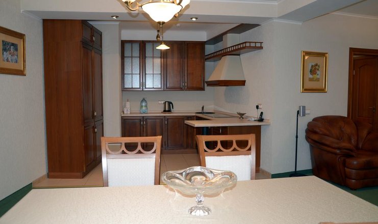 В номере: Кухня, вешалка, диван раскладной, зеркало, комод, кровать двуспальная, прикроватные тумбочки, столик журнальный, стулья, шкаф-купе, гладильная доска, кондиционер, музыкальный центр, набор посуды, электроплита, посудомоечная машина, сейф, TV, телефон, теплый пол, утюг, холодильник, чайный набор посуды, электрочайник