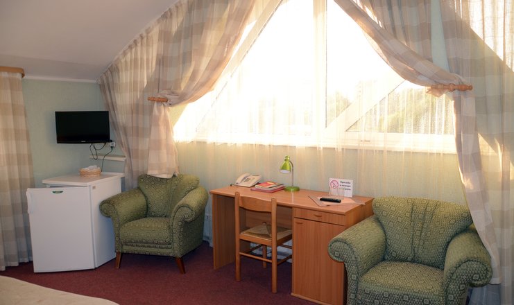 В номере:вешалка, зеркало, кровати односпальные /одна двуспальная кровать, прикроватные тумбочки, стол, стулья, тумба багажная, шкаф-купе, кондиционер, мини-холодильник, телевизор, телефон
