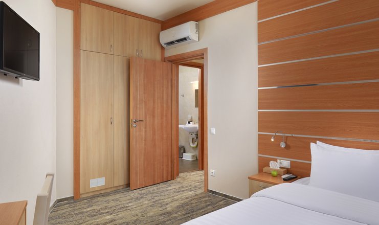 В номере: вешалка, зеркало, кровати односпальные, кровать двуспальная: 160х200,  еврораскладушка: 80х195 см на доп. место, прикроватные тумбочки, стол, стул, шкаф-купе, шкаф встроенный, гладильная доска, мини-холодильник, сейф, сплит-система, телевизор: 2, телефон, утюг
