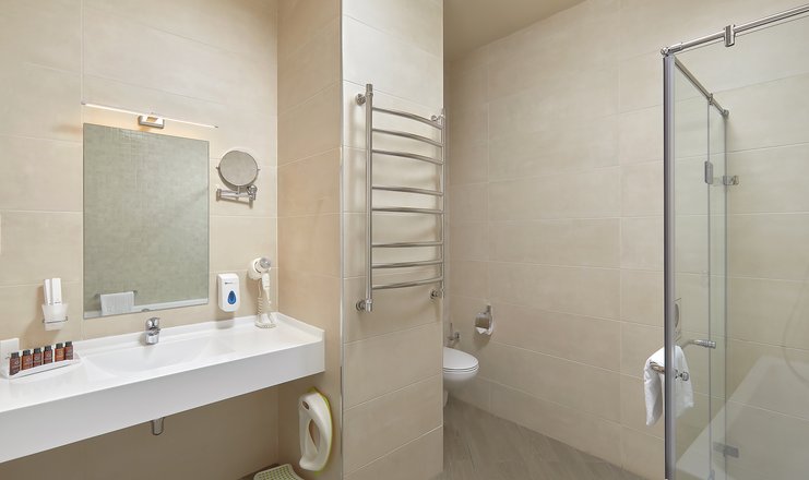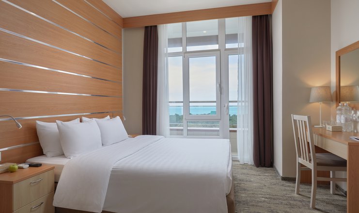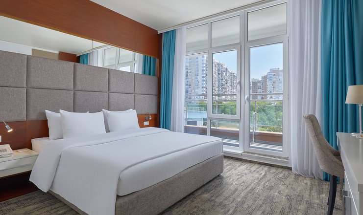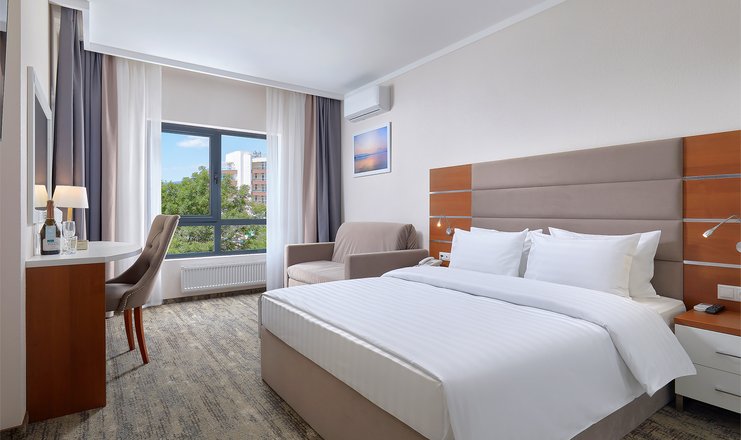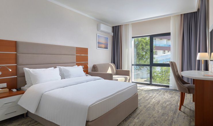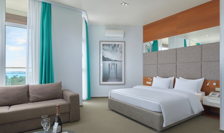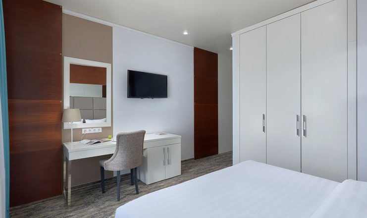 В номере: вешалка, диван, зеркало, кресло, кровать двуспальная: 160х200 см, Двухместный диван или одноместный диван и кресло-кровать/еврораскладушка на 2 доп места, прикроватные тумбочки, столик журнальный, столик туалетный, стул, шкаф встроенный, гладильная доска, мини-холодильник, сейф, сплит-система, телевизор ЖК,  телефон, утюг