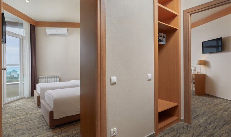 В номере: вешалка, зеркало, кровать двуспальная, кровать односпальная, раскладной диван: 144 х 100 см на доп место, прикроватные тумбочки, стол, стул, шкаф, гладильная доска, мини-холодильник, сейф, сплит-система, телевизор: 2,телефон, утюг