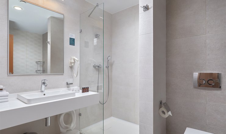 Санузел: тапочки: для основных мест, туалетные принадлежности, фен: зеркало, светильник над зеркалом, зеркало косметическое, диспенсер с гигиеническими пакетами, детская подставка для ног, детское сиденье на унитаз, халат: для основных мест