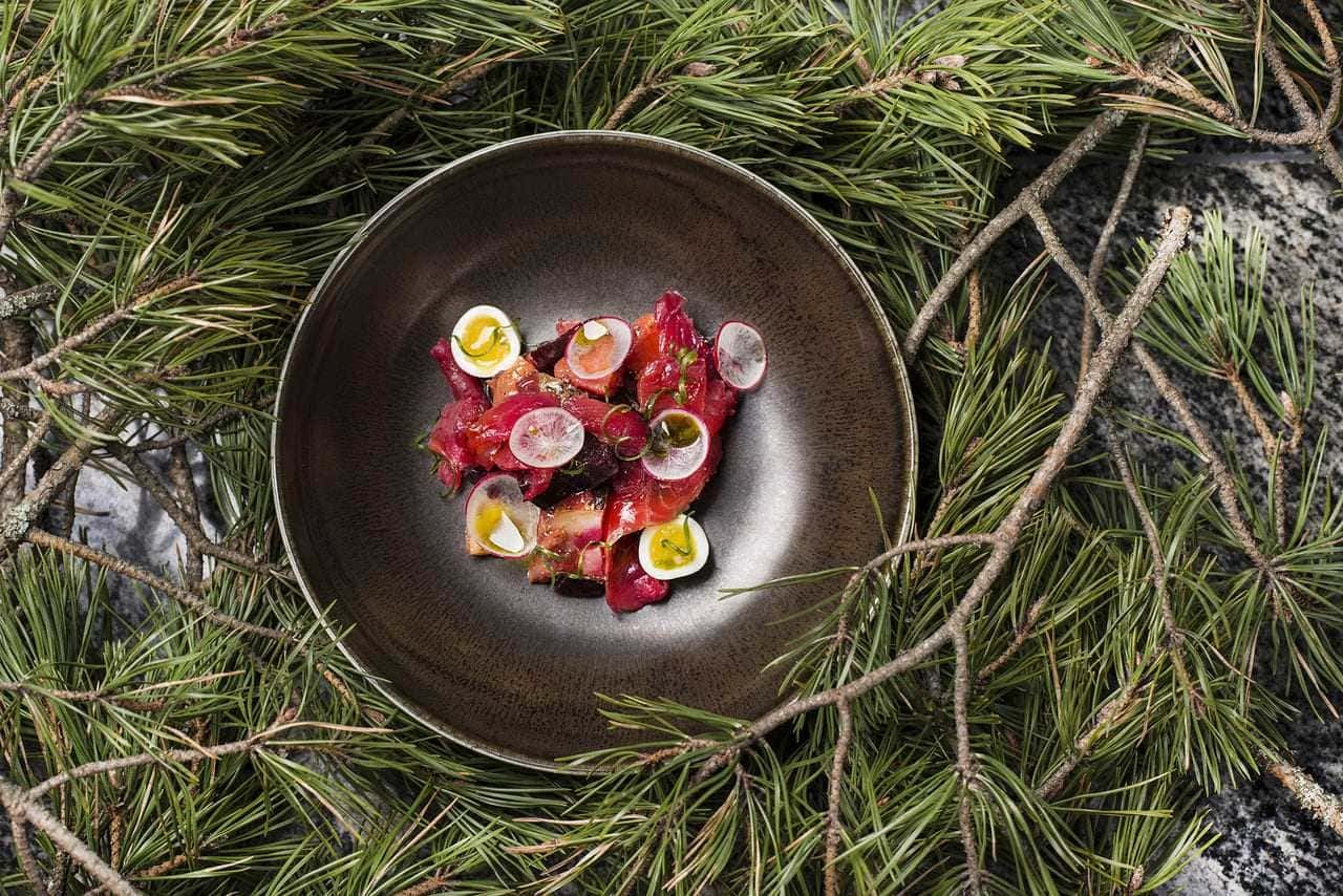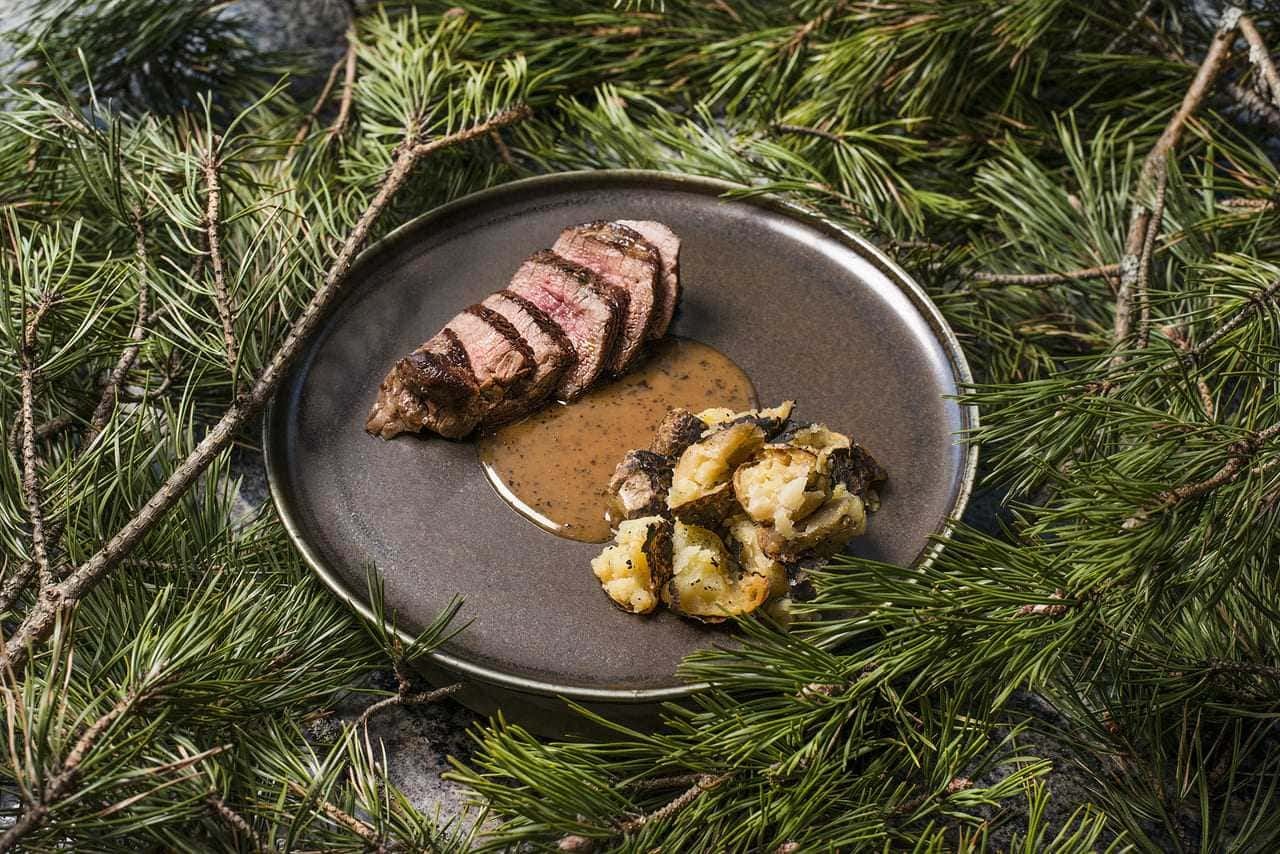 В меню представлены блюда истинно карельской кухни: традиционная уха, калитки, рыба. Традиционные карельские калитки – это горячие открытые карельские пирожки с наливками, начинками, припеками, смазанные сливочным маслом. В нашей интерпретации — это ржаное тесто с подушечкой из картофельного крема, сверху мы кладем тартар из карельской форели и украшаем завитками зеленого лука. Можно есть их с утра и до ночи!