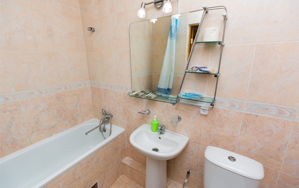 Санузел: ванна, раковина, унитаз, туалетные принадлежности, фен