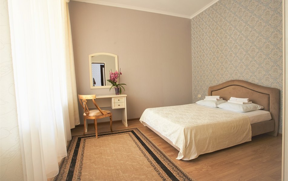 В номере: вешалка, зеркало, кресло, диван, кровати односпальные /одна двуспальная кровать, прикроватные тумбочки, стол, столик журнальный, шкаф, телевизор, телефон, холодильник, чайный набор посуды, электрочайник