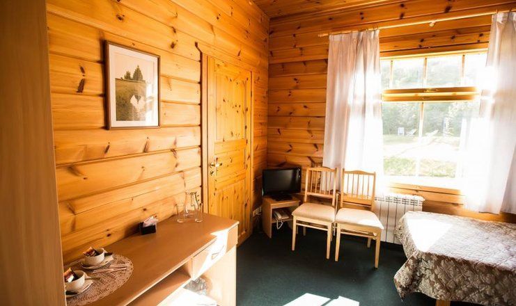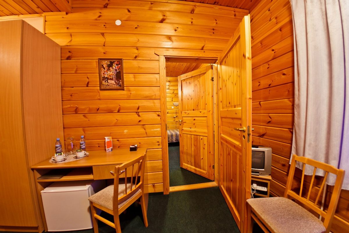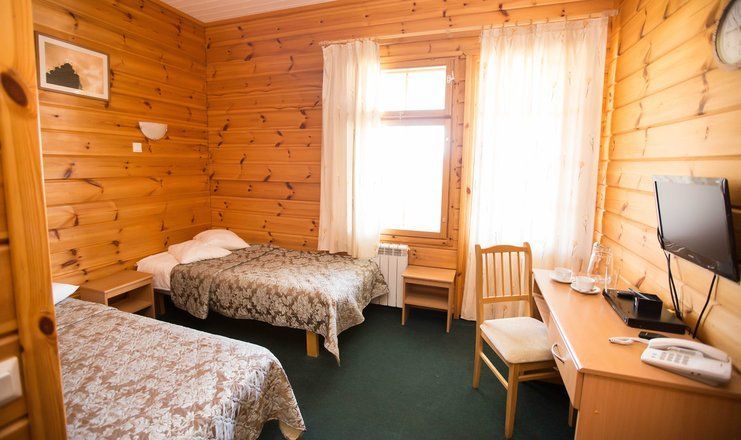 В номере: две кровати односпальная, прикроватные тумбы, стол, стулья, шкаф, телевизор, телефон