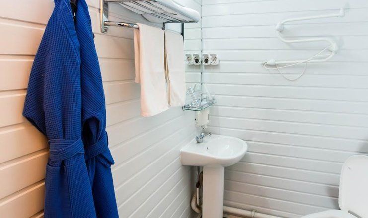 Санузел: душевая кабина, раковина, унитаз, фен