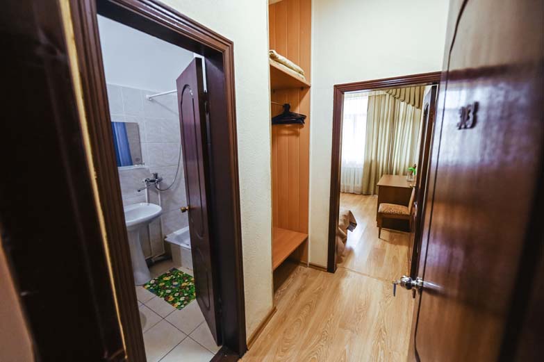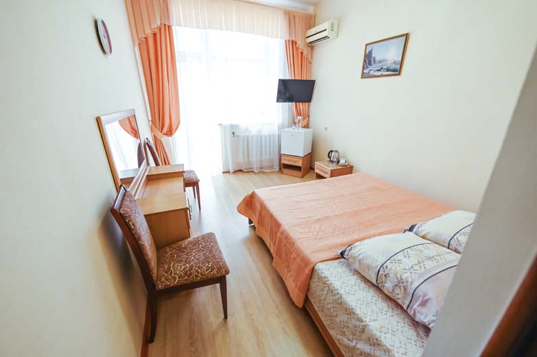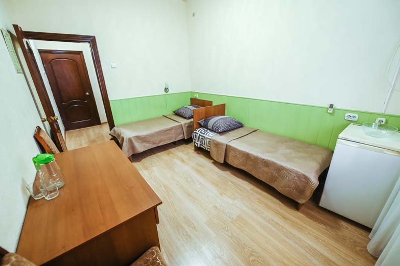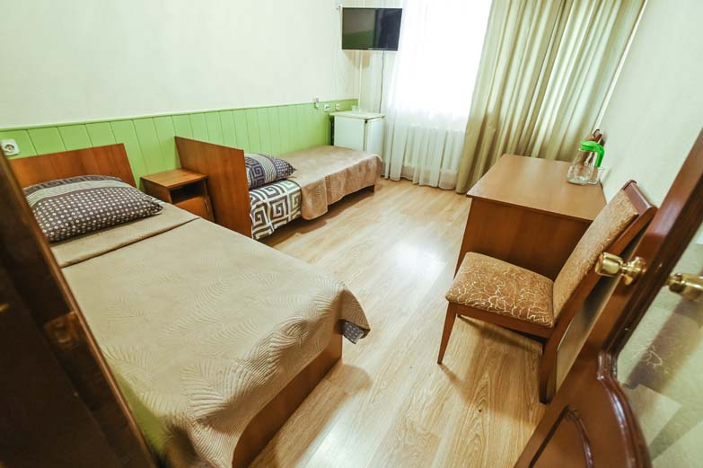Оснащене номера: вешалка, кровати односпальные, прикроватные тумбочки, стол, стулья, шкаф, сплит-система, телевизор, холодильник