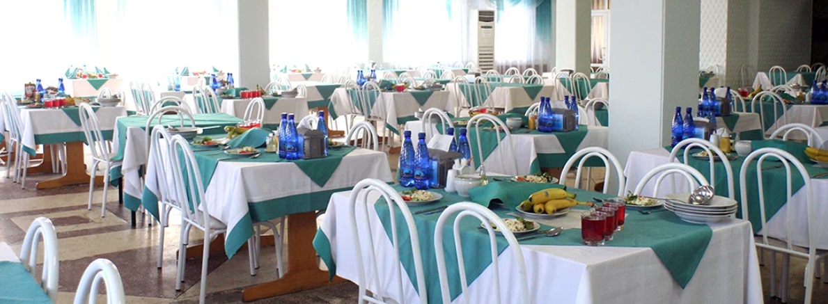 Столовая на 1000 посадочных мест, расположенная на территории санатория «Ейск», состоит из четырех залов: белый, розовый, зеленый и зал повышенной комфортности.