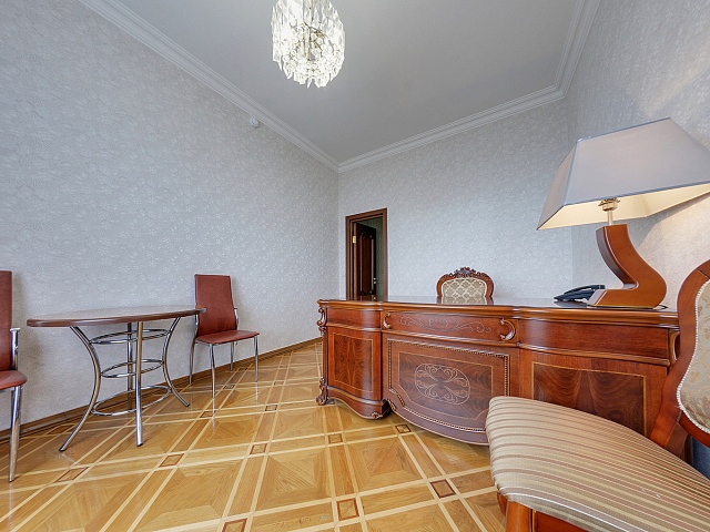 В номере: 2 комнаты, 2 кровати, диван, 2 кресла, тумба прикроватная, тумба TV, журнальный столик, стол туалетный с зеркалом, платяной и встроенный шкафы, телевизор, кондиционер, холодильник, телефон