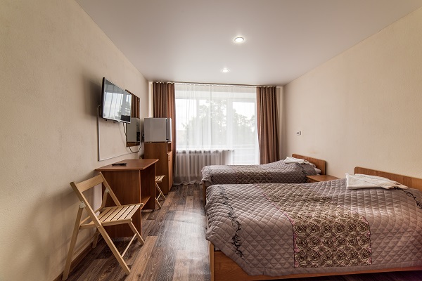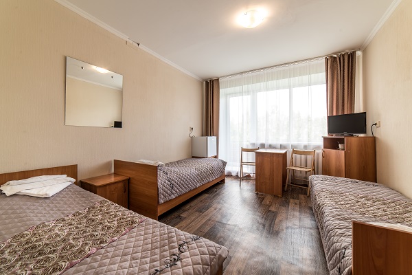 В номере: две или три односпальные кровати, прикроватные тумбы, шкаф, журнальный столик, телевизор, холодильник, чайный набор посуды, электрочайник