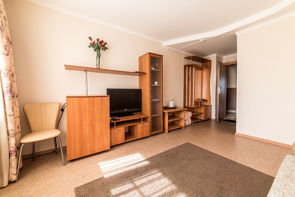 В номере: две комнаты: спальня и гостиная, две односпальные кровати, прикроватные тумбы, шкаф, журнальный столик, раскладной диван, стенка, телевизор, холодильник, чайный набор посуды, электрочайник