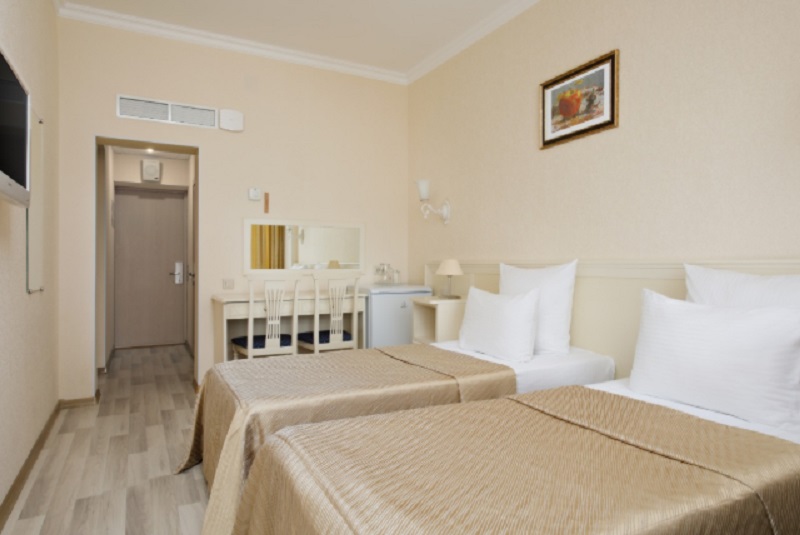 В номере: две односпальные кровати, тумбы прикроватные, стол, стулья, телевизор, холодильник, сейф, электрический чайник, набор посуды, телефон