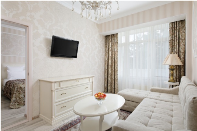 В номере: две комнаты: спальня и гостиная, двуспальная кровать, тумбы прикроватные, стол, стулья, мягкая мебель, телевизор с кабельным телевидением, холодильник, сейф, электрический чайник, телефон, кондиционер