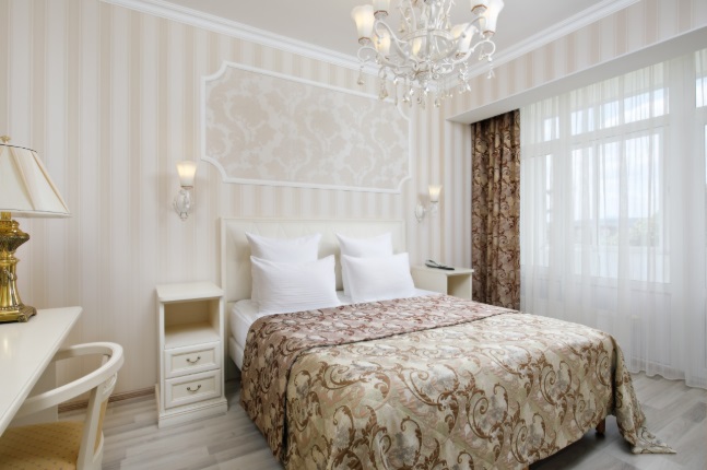 В номере: полутораспальная кровать, тумбы прикроватные, стол, стулья, телевизор, холодильник, сейф, электрический чайник