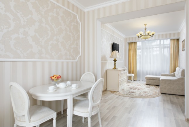 В номере: три комнаты: спальня, гостиная, столовая зона, двуспальная кровать, тумбы прикроватные, стол, стулья, обеденная группа, мягкая мебель, телевизор с кабельным телевидением, холодильник, сейф, электрический чайник, телефон, кондиционер