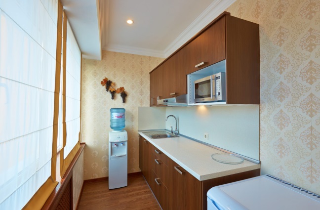 В номере: четыре комнаты: спальня, гостиная, кухня, кабинет, двуспальная кровать, тумбы прикроватные, стол, стулья, обеденная группа, мягкая мебель, кухонная мебель, телевизор с кабельным телевидением, холодильник, сейф, электрический чайник, свч-печь, телефон, кондиционер