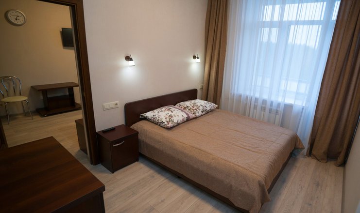В номере: Гостиная, совмещенная с прихожей и мини-кухней: раскладной диван, журнальный столик, ЖК телевизор, 2 стула, шкаф-купе, вешалка для верхней одежды.