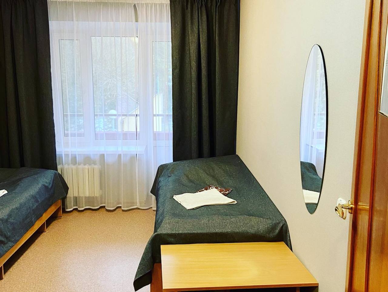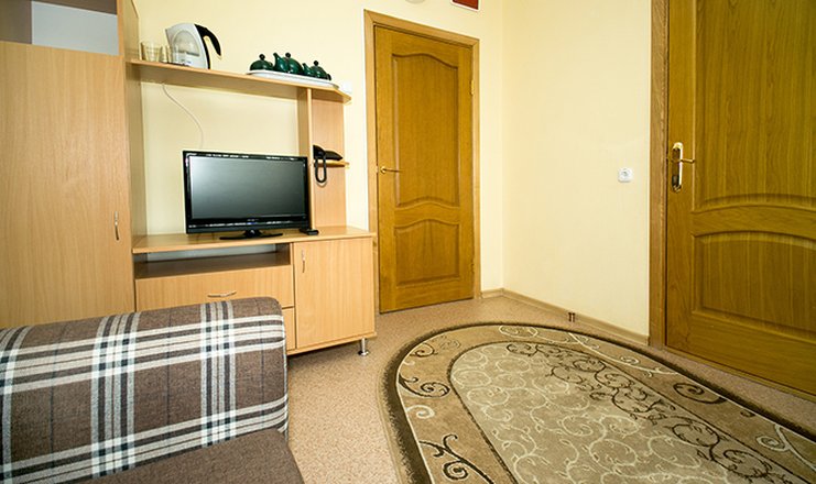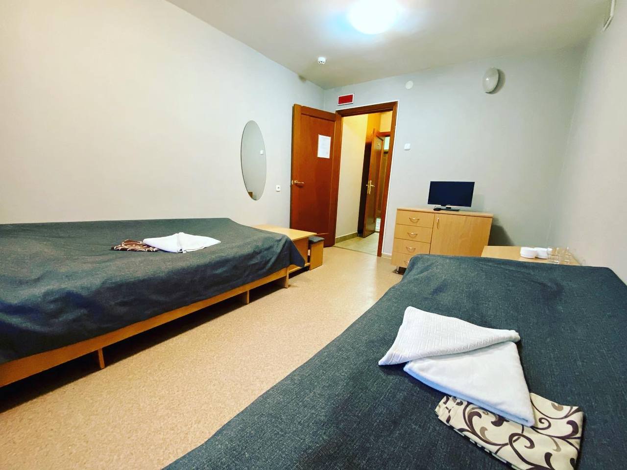 В номере: вешалка, зеркало, комод, кровати полутороспальные, стол, шкаф, мини-холодильник, набор посуды, телевизор