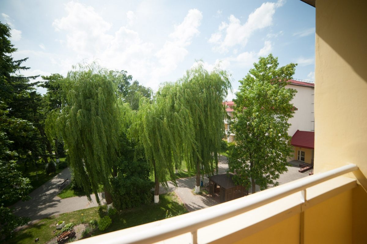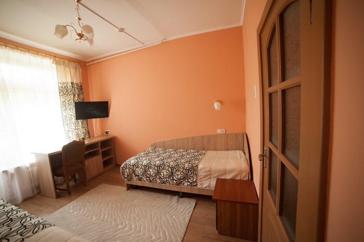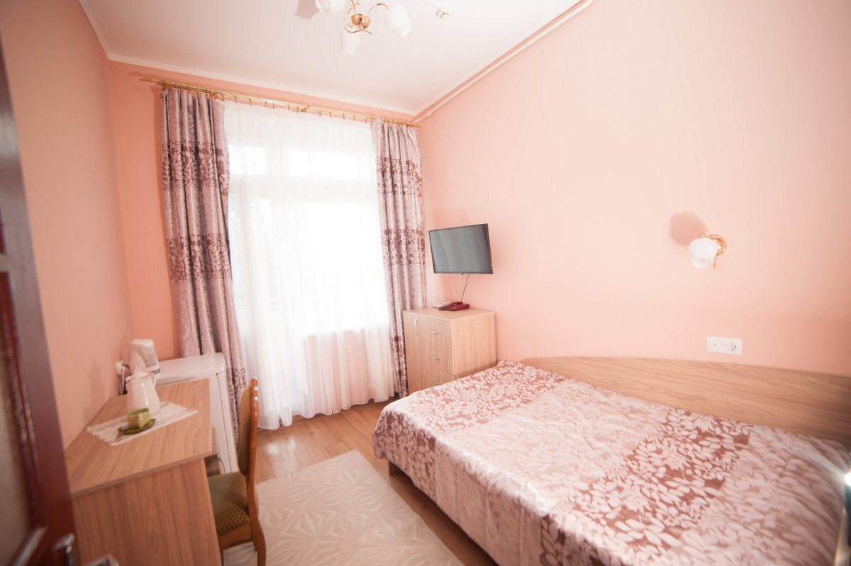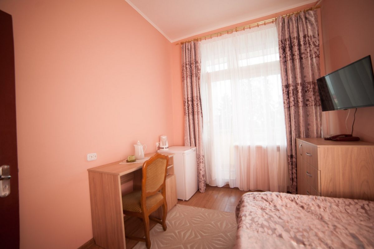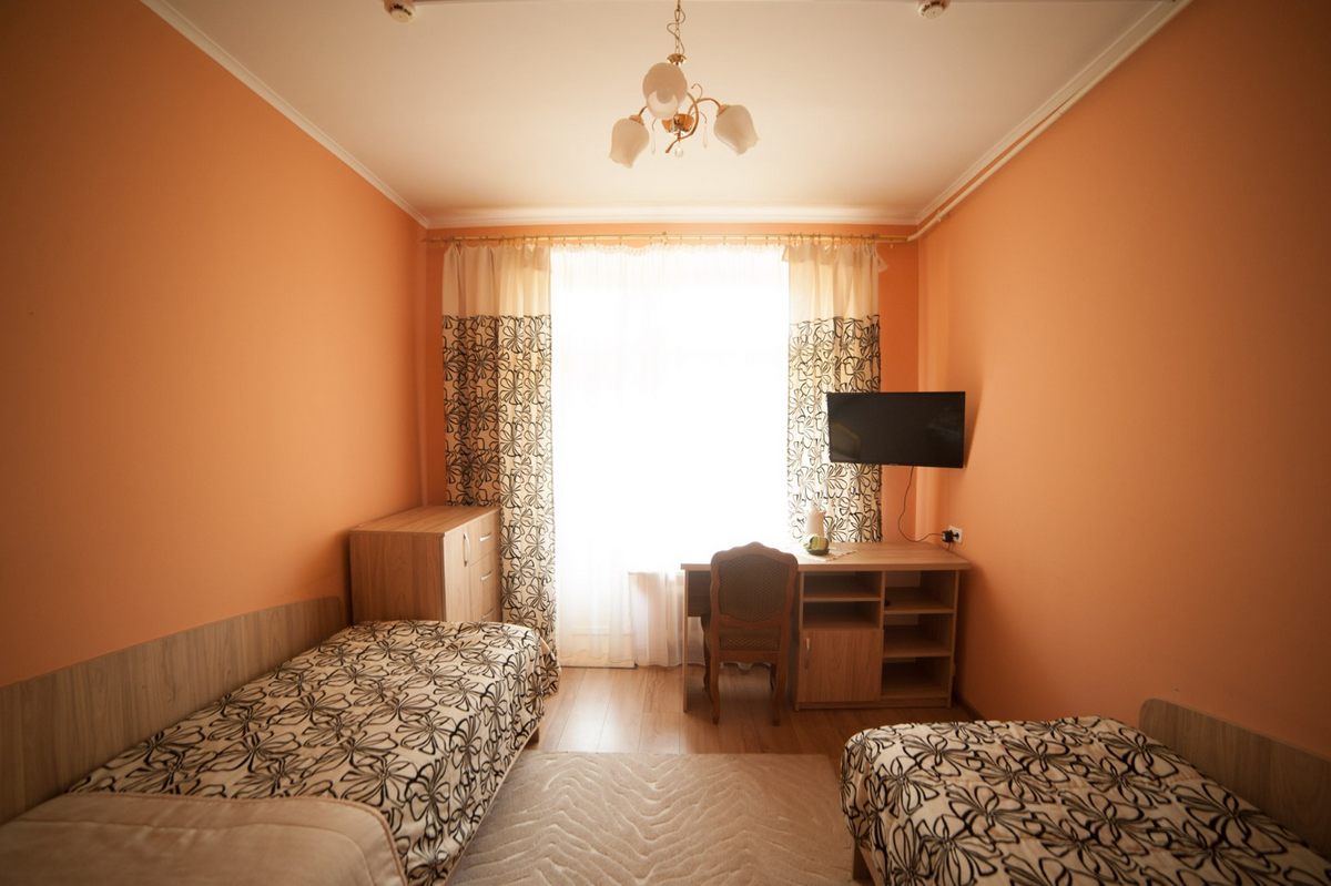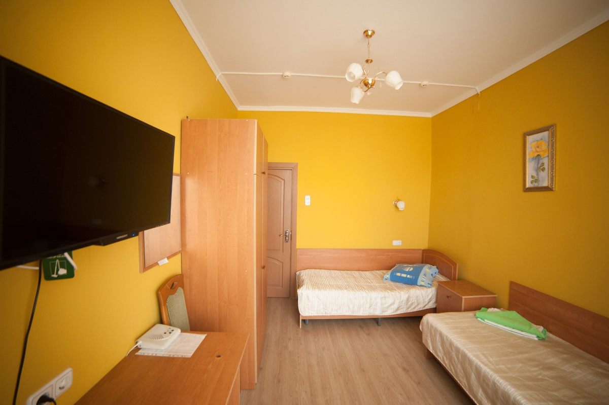 В номере: две односпальные кровати, прикроватные тумбы, стол, стулья, шкаф, телевизор ЖК, холодильник, электрочайник, набор посуды