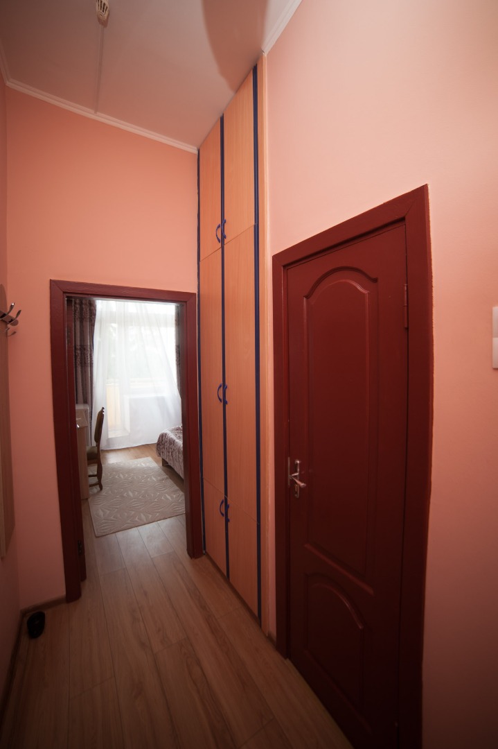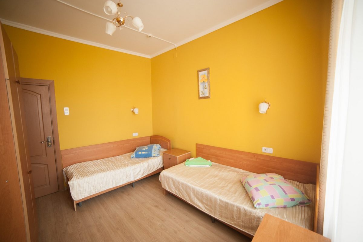 В номере: две односпальные кровати, прикроватные тумбы, стол, стулья, шкаф, телевизор ЖК, холодильник (в тамбуре), набор для воды