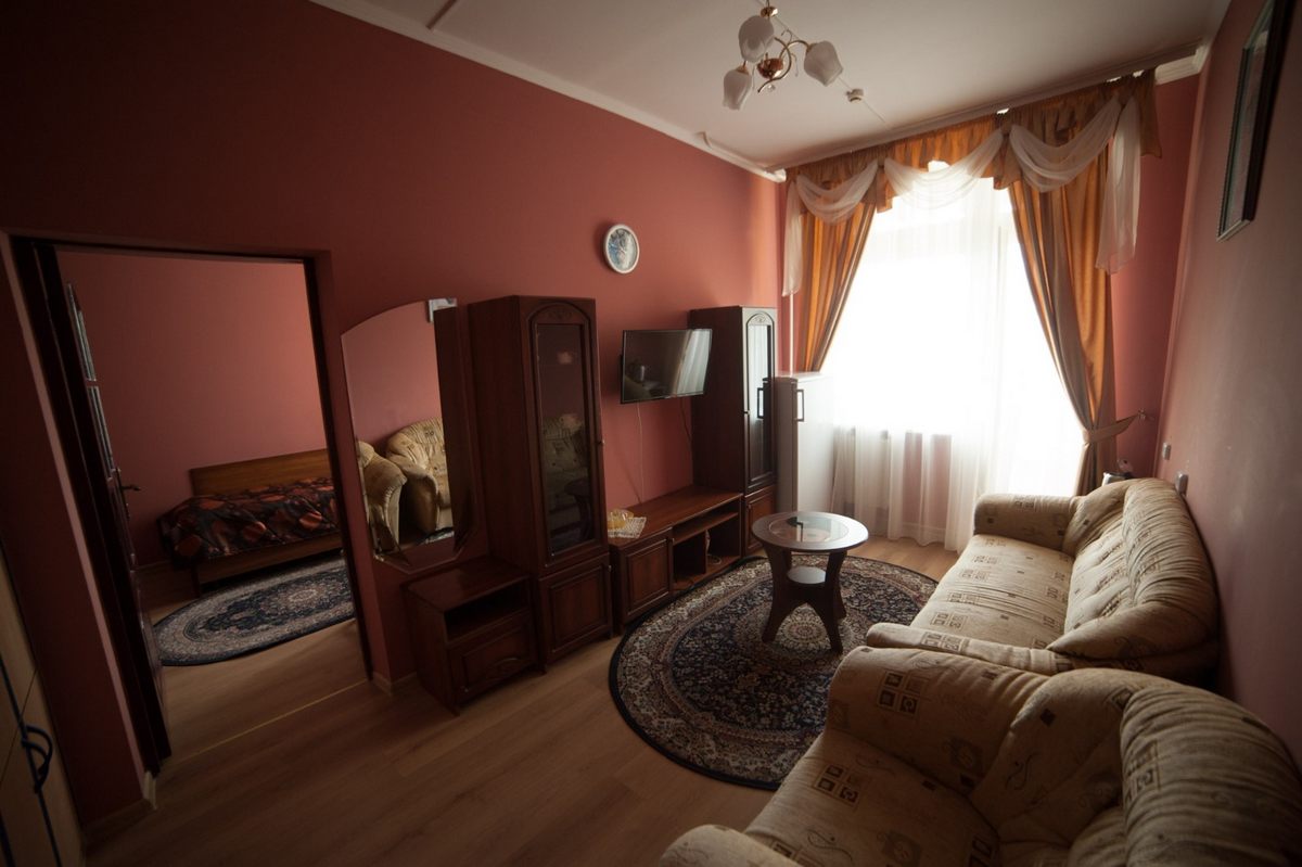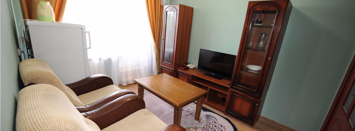 В номере: две комнаты: спальня и гостиная, две односпальные кровати, прикроватные тумбы, стол, стулья, шкаф, мягкая мебель, журнальный столик, мебельная стенка, телевизор ЖК, холодильник, утюг, электрочайник, набор посуды