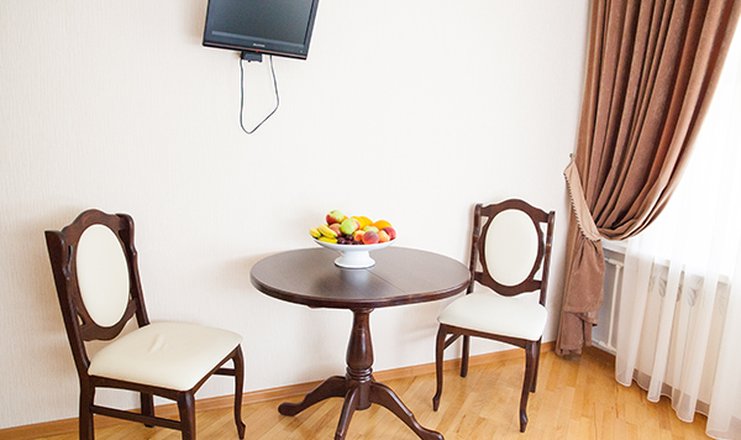 В номере: кровати односпальные или одна двуспальная, прикроватные тумбочки, стол, стулья, шкаф, мягкая мебель, журнальный стол, телевизор, холодильник