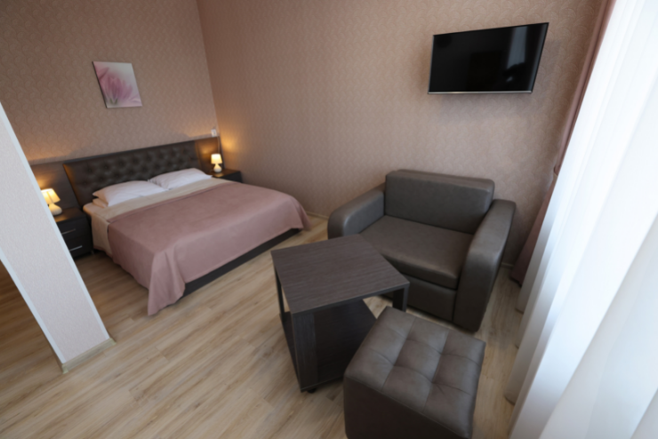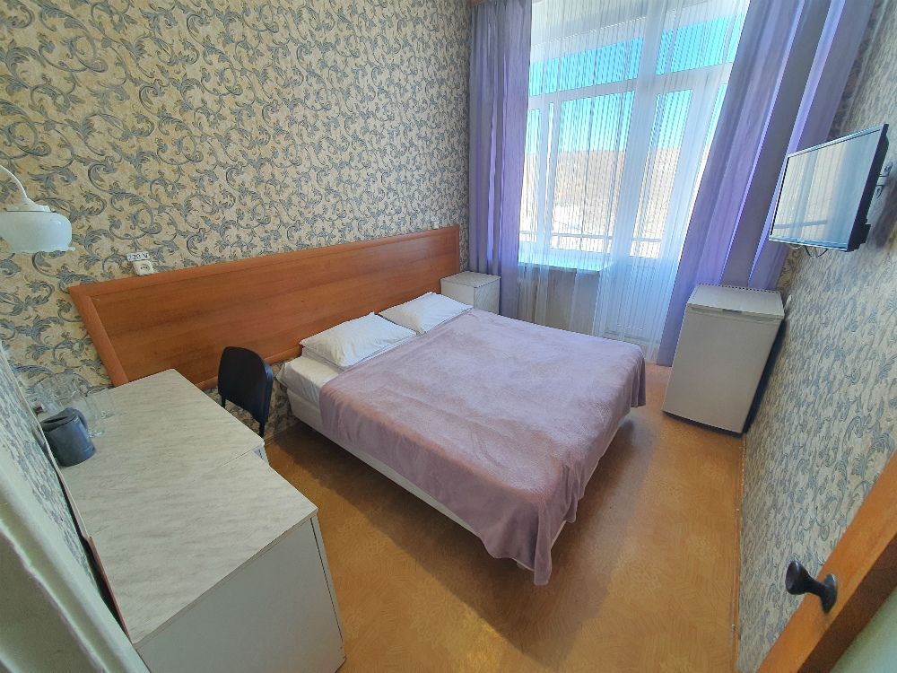 Оснащение номера: односпальная либо двуспальная кровать, прикроватная тумба, стол, стулья, шкаф, телевизор, холодильник, электрочайник, бесплатный интернет Wi-Fi