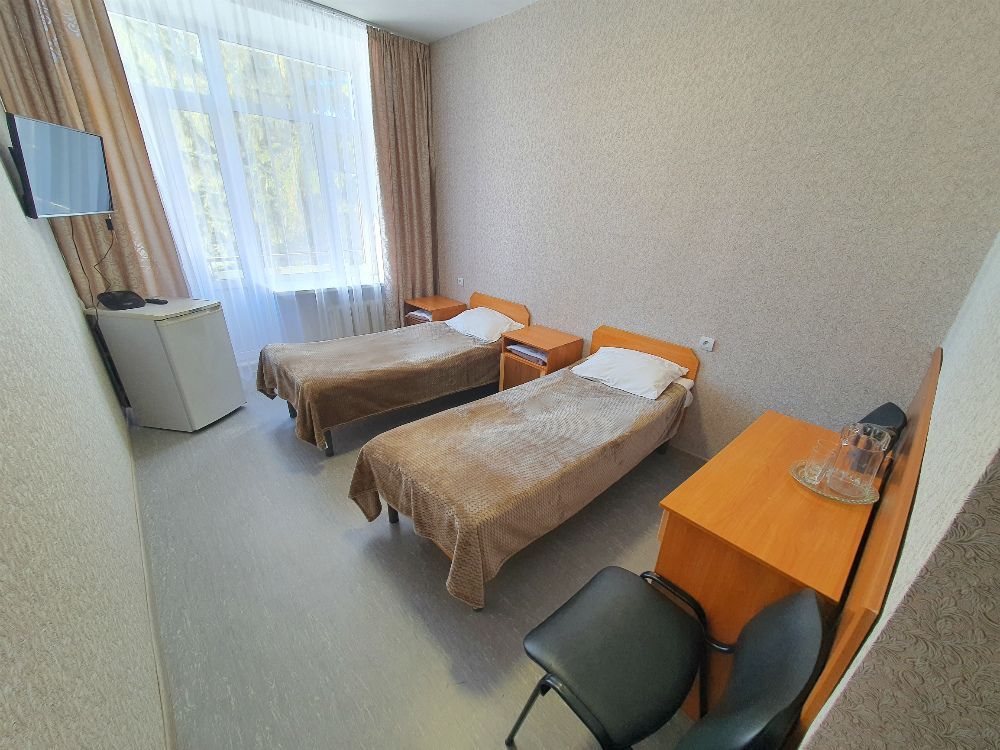 Оснащение номера: две односпальные кровати, прикроватные тумбы, стол, стулья, шкаф для одежды, телевизор, холодильник, электрочайник, бесплатный интернет Wi-Fi