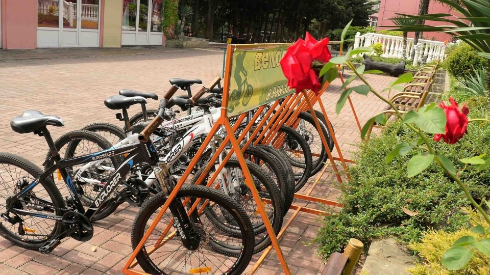 Спорт : открытый взрослый (9*21м) и детский бассейны (6*6м), тренажерный зал, волейбольная площадка, настольный теннис, прокат спортинвентаря, велосипедов, роликов.