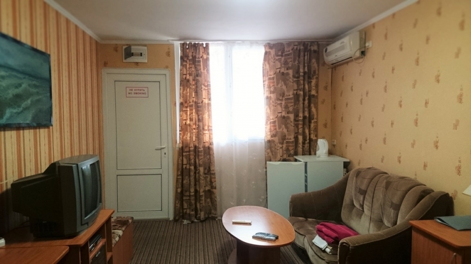 В номере: одна 2-ух спальная кровать, рядом раскладной диван, телевизор, кондиционер, холодильник, сейф, расширенный набор посуды, электрический чайник.