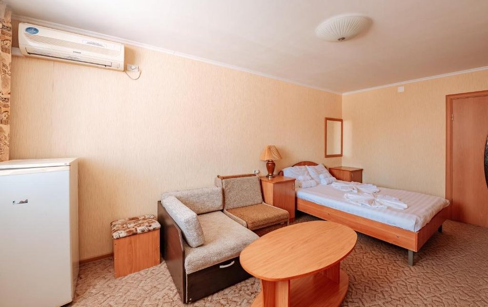 В номере: телевизор, кондиционер, холодильник, телефон, набор посуды, санузел, душ, сейф, кресло-кровать.