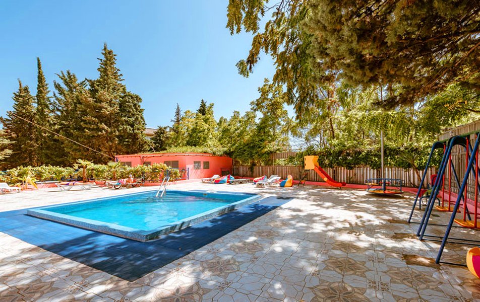 Спорт : открытый взрослый (9*21м) и детский бассейны (6*6м), тренажерный зал, волейбольная площадка, настольный теннис, прокат спортинвентаря, велосипедов, роликов.