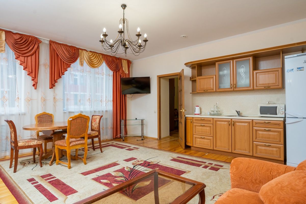 В номере: 2 спальни, гостиная с кухонной зоной, ванная комната. В спальне 1: двуспальная кровать, в спальне 2: двуспальная кровать, в гостиной: диван, ТВ. В кухонной зоне: СВЧ-печь, чайник, холодильник, набор посуды, обеденный стол. В ванной комнате: ванна или душевая кабина, туалет.