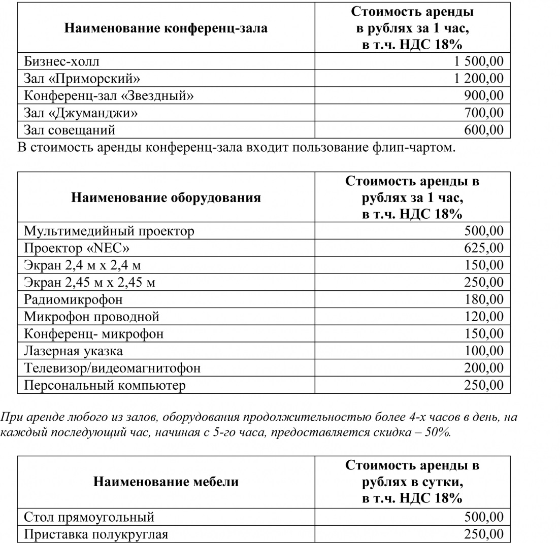Прайс на аренду в Alean Family Sputnik – Услуги и цены