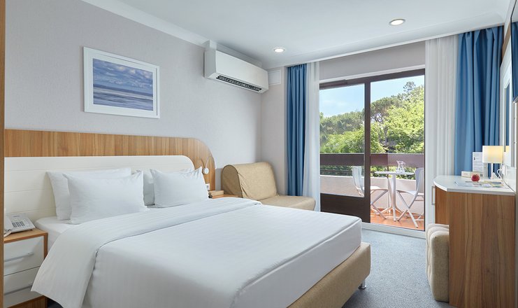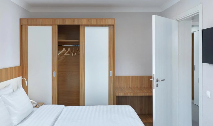 Оснащение номера: кресло-кровать, кровать двуспальная, прикроватные тумбочки, столик туалетный, стул, тумба багажная, шкаф, гладильная доска, мини-холодильник, набор посуды: бутылка с крышкой, 2 стакана, сейф, сплит-система, телевизор, телефон: внутренняя связь, утюг
