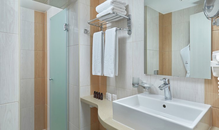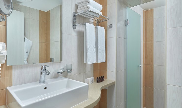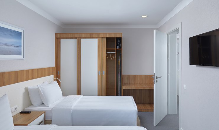 Оснащение номера: зеркало, кровати односпальные /одна двуспальная кровать, прикроватные тумбочки: и лампа настольная, стол, стул, тумба багажная, шкаф-купе, гладильная доска, мини-холодильник, сейф, сплит-система, телевизор ЖК: 32 дюйма, телефон, утюг, чайная станция