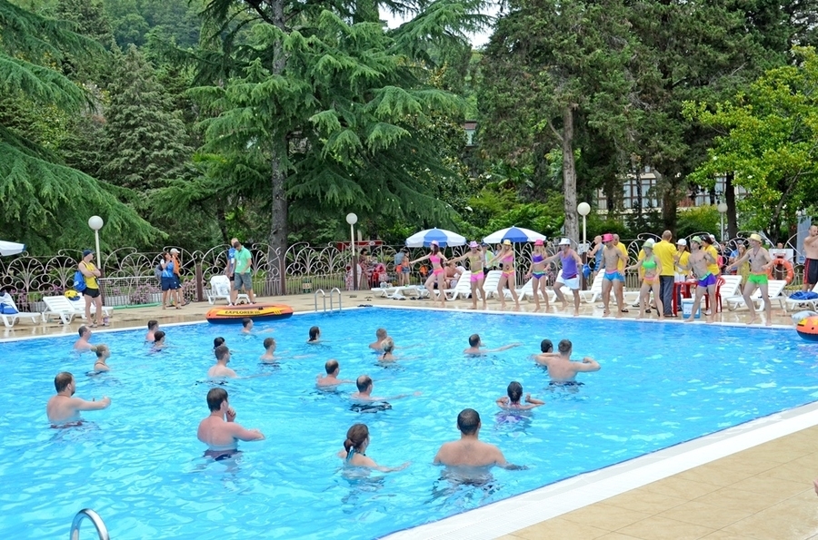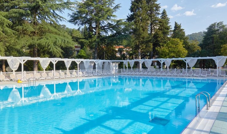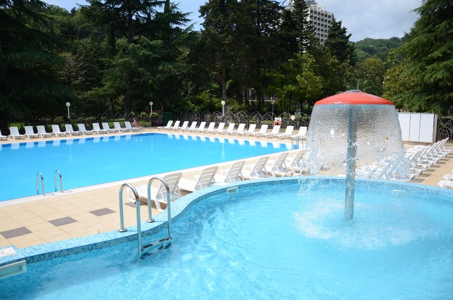 Открытый плавательный бассейн в сантории Спутник в Сочи, с подогреваемой водой +27 C (всесезонный), с каскадным водопадом, противотоками и гидромассажем, длина дорожки 25 м, глубина 1,8 м; «малая чаша» бассейна (работает в летний период).
