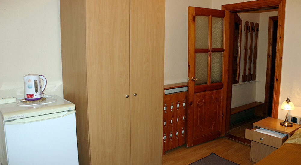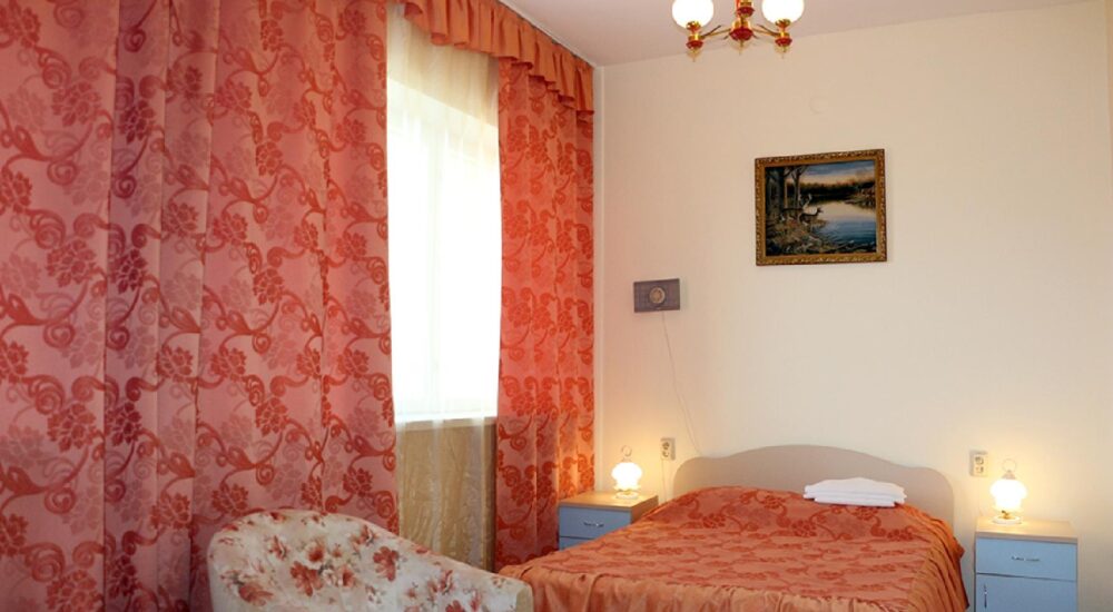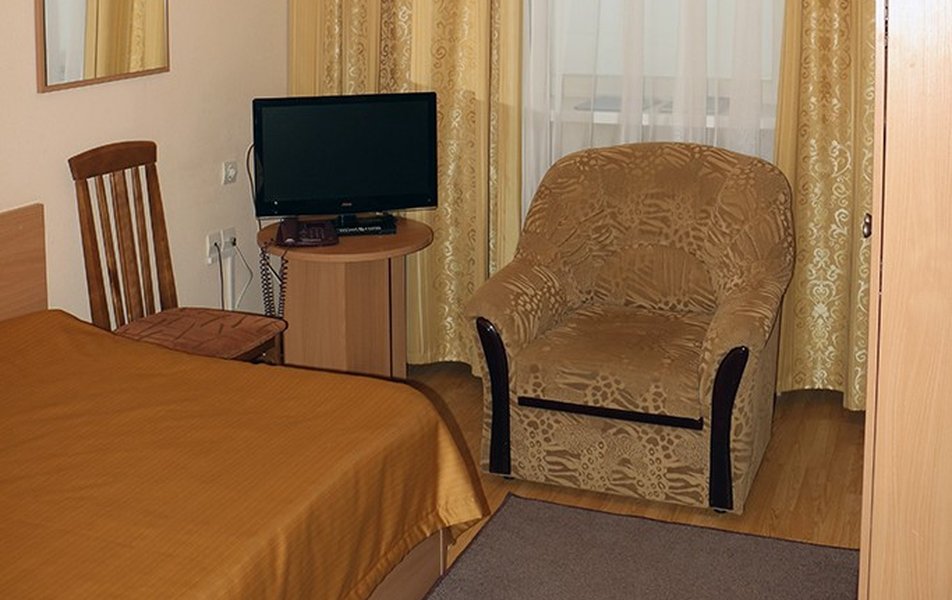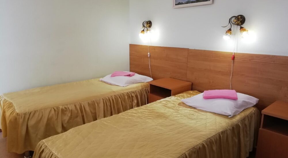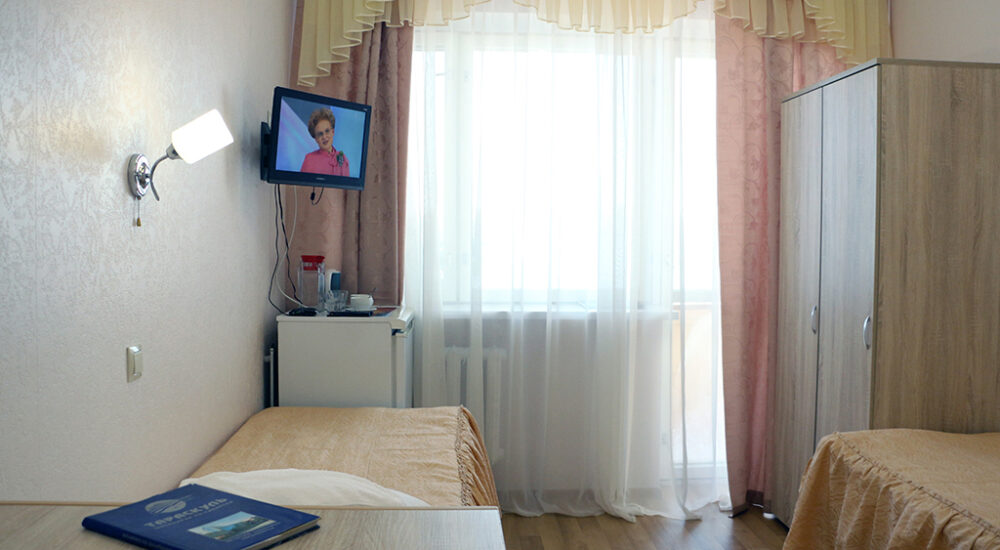 В номере: две односпальные кровати, прикроватные тумбочки, два стула, кресло или диван, шкаф для одежды и личных вещей, зеркало, вешалка для верхней одежды, холодильник, телевизор, телефон, чайник, чайный набор. По просьбе Гостя – сушилка для белья, фен