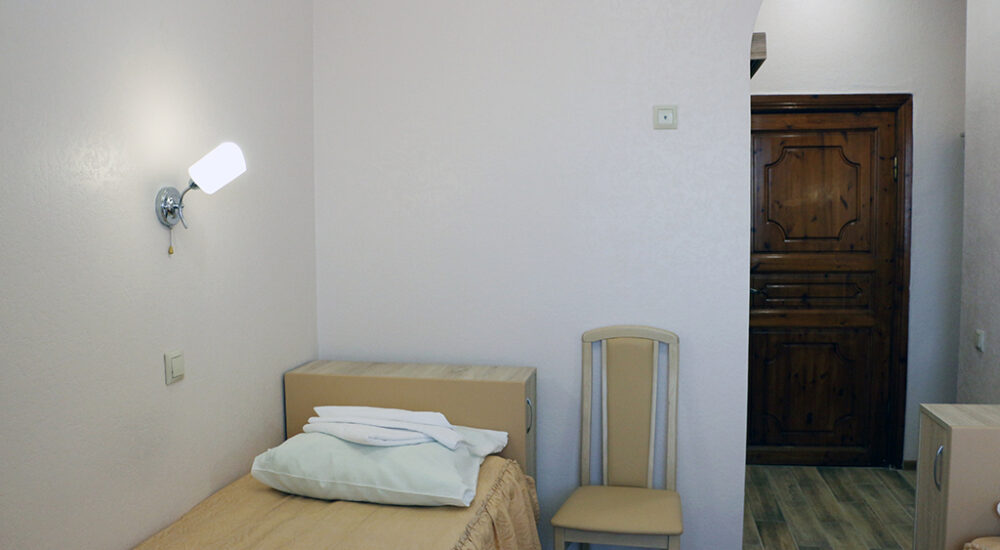 В номере: одна полутороспальная кровать, прикроватная тумбочка, стул, шкаф для одежды, зеркало, вешалка для верхней одежды, холодильник, телевизор, телефон, чайник, чайный набор на одну персону